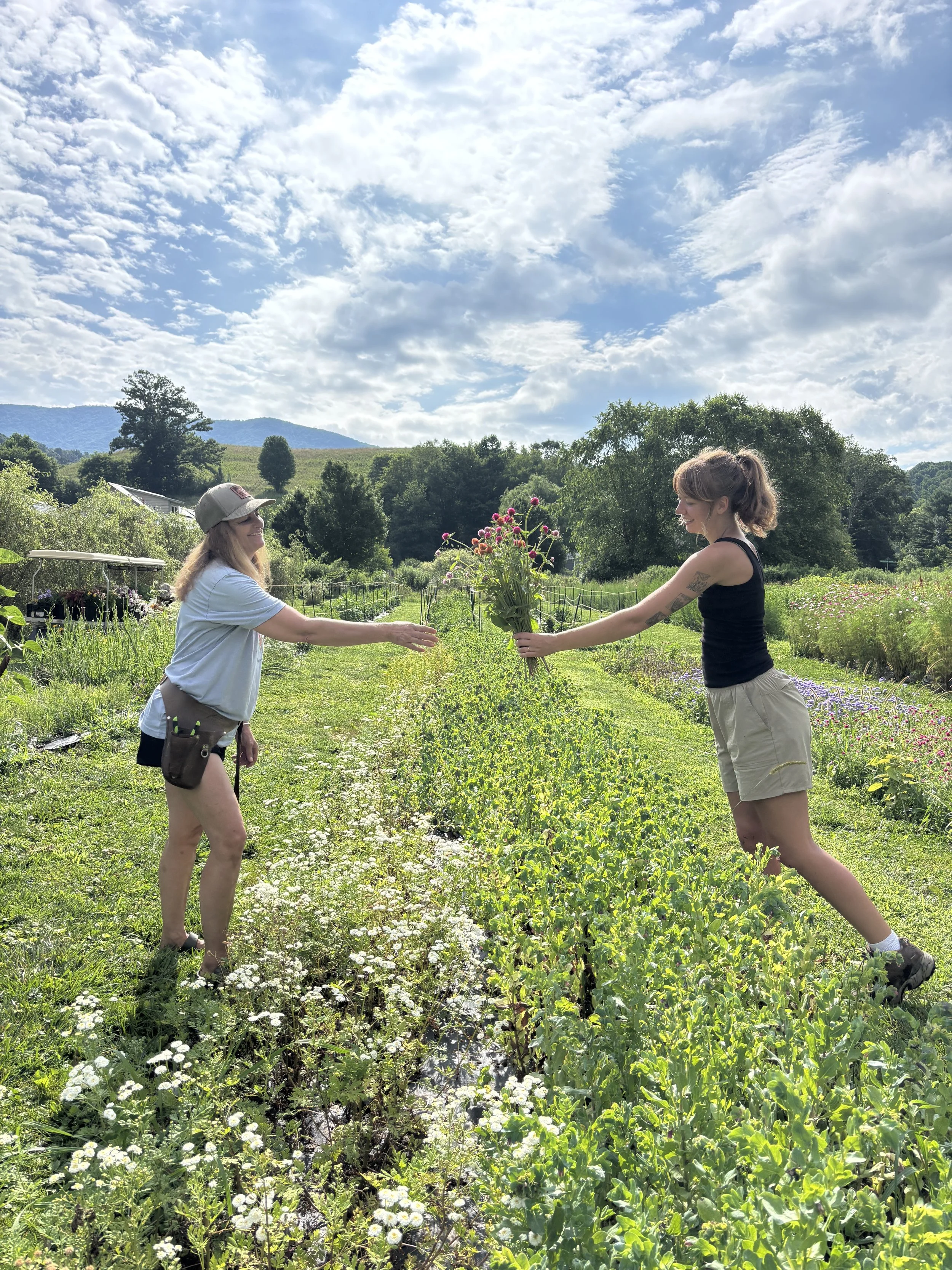 “At Springhouse Organic Farm you're not simply an intern or a farm worker, you are family! Creating community is very important to Amy Fiedler, the owner. As you drive up to the farm you see the honor system farm stand and the many farm dogs to greet you. There are farm-to-table dinners, you-pick flowers, countless workshops and farm tours that bring hundreds of people to the farm each season. The farm provides produce and flowers to local restaurants, local florists, and the local food shelter. Venture out to the Watauga County Farmers Market on a Saturday and you'll see Amy sitting with her interns proudly selling the fruits of their labor. Farming provides so much more than produce and flowers. Nature nurtures you as you work with it and around it to grow tiny seeds into beautiful plants. While you may spend only a season or two working at the farm, Springhouse Farm is a lifelong place to call home.”